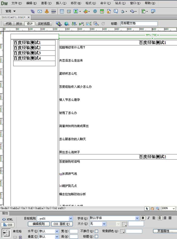 2、OK,這是我剛剛創建的一個頁面,左側為目錄,右邊為頁面。我們發現右面的頁面相對較長,不能完全顯示。這個時候,我們就需要錨點鏈接。當我們想點擊“目錄”百度經驗測試3,就跳轉到相對應的右側測試3頁面,就需要有錨點鏈接。