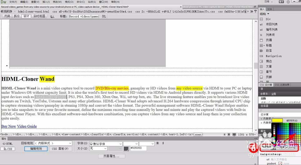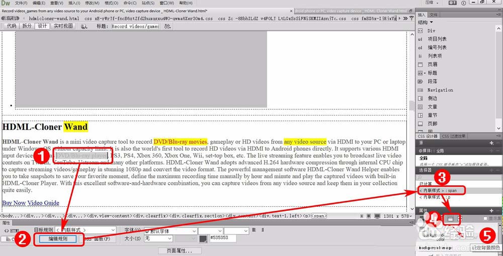 2、 選中需要修改背景色的文字,點擊“編輯規(guī)則”按鈕,點擊“<內(nèi)聯(lián)樣式>:span”,點擊“背景”按鈕,點擊“設(shè)定背景顏色”