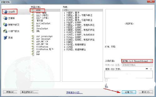 3、在新建文檔窗口,選擇“空白頁”—“HTML”,文檔類型選擇“XHTML1.0 transitional”,單擊“創建”按鈕。