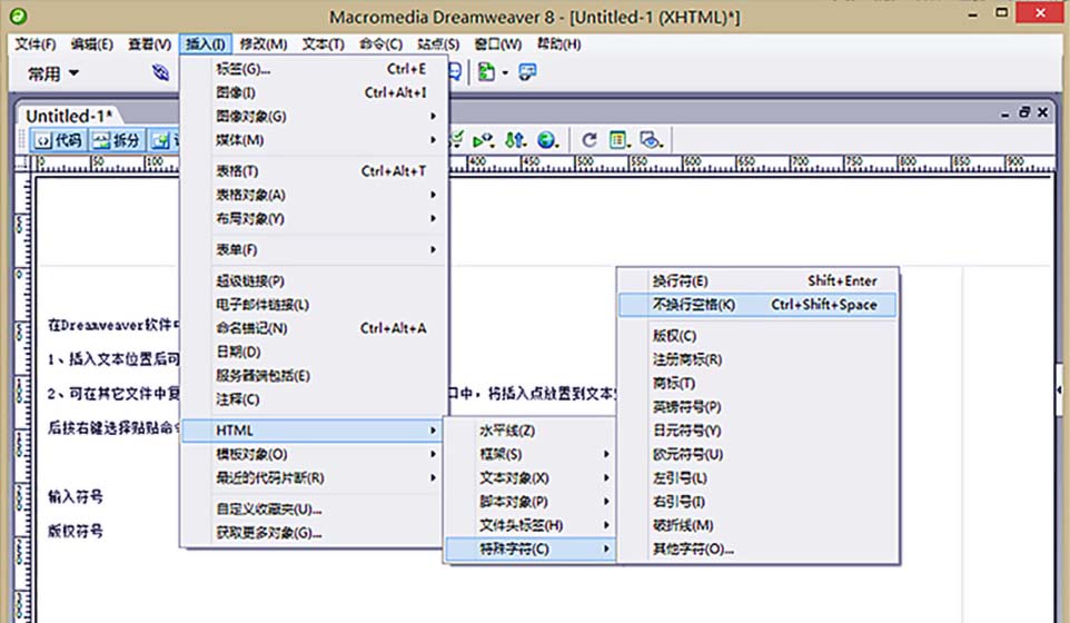 5、需要“插入空格”選擇【輸入】→【HTML】→【不換行空格】命令,直接按Ctil→Shift→Space組合鍵。