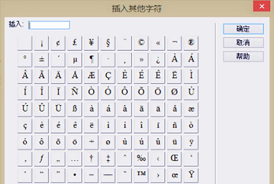 4、在Dreamweaver文檔窗口中選擇【輸入】→【HTML】命令后,選擇【特殊符號】→【其他符號】,系統會彈出其他字符對話框,選擇【確定】命令后,用戶便可輸入其他字符。