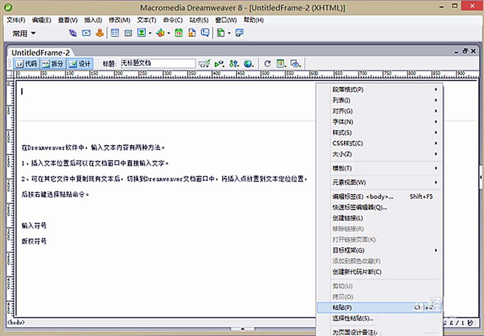 1、輸入文本內容除了在Dreamweaver文檔窗口中直接輸入文字,還可以在其它文件中復制現有文本,切換到Dreamweaver文檔窗口中,將插入點定位放置到文本位置后,按右鍵選擇貼貼命令即可。