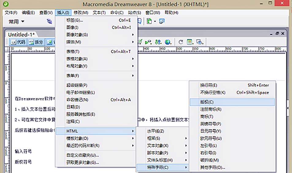 3、在主菜單中選擇【輸入】→【HTML】命令, 打開HTML菜單窗口后選擇【特殊符號】,打開下一個菜單。 單擊【版權】選項可插入版權符號,此外用戶可以根據自身需要,輸入【HTML】特殊符號窗口中的任意一種符號。