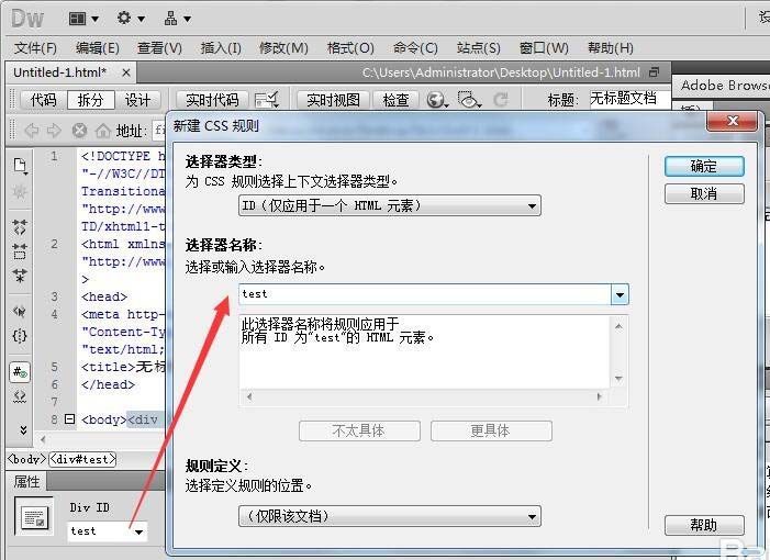 4、然后選擇ID選擇器,選擇器名稱也輸入test