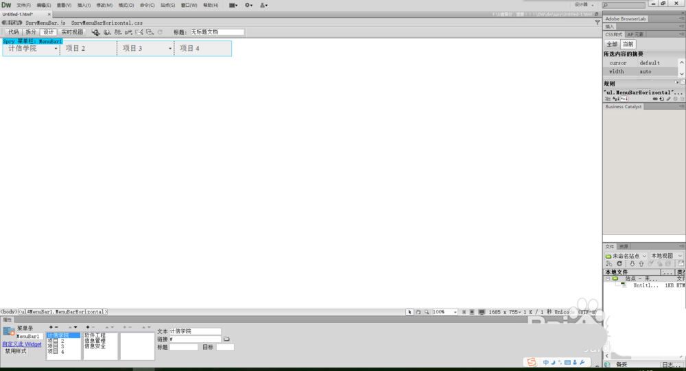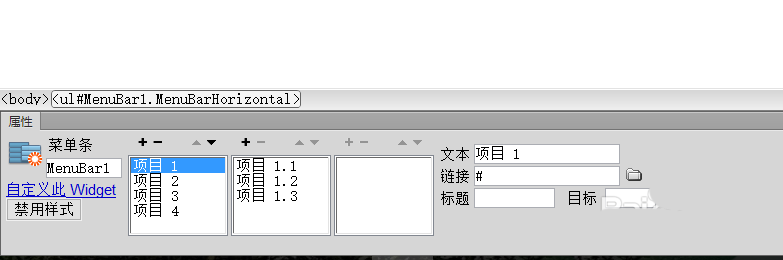 選擇上方的“插入”,找到”布局對象“,選擇”spry菜單欄“,布局可根據需要選擇,這里我選擇了水平,菜單欄創建完成,點擊項目1上方的藍色區域,即”Spry 菜單欄:MenuBar1“,可以設置菜單欄的屬性。