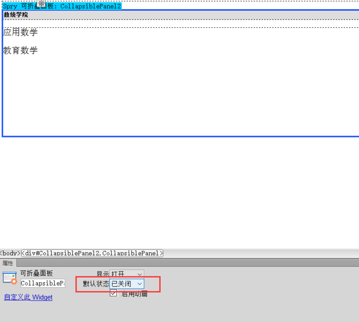 另外,可折疊式面板的屬性中可以設置打開的默認狀態,我將第二個可折疊式面板的默認狀態設置成了關閉,那么打開網頁的時候就不會顯示第二個面板的內容。