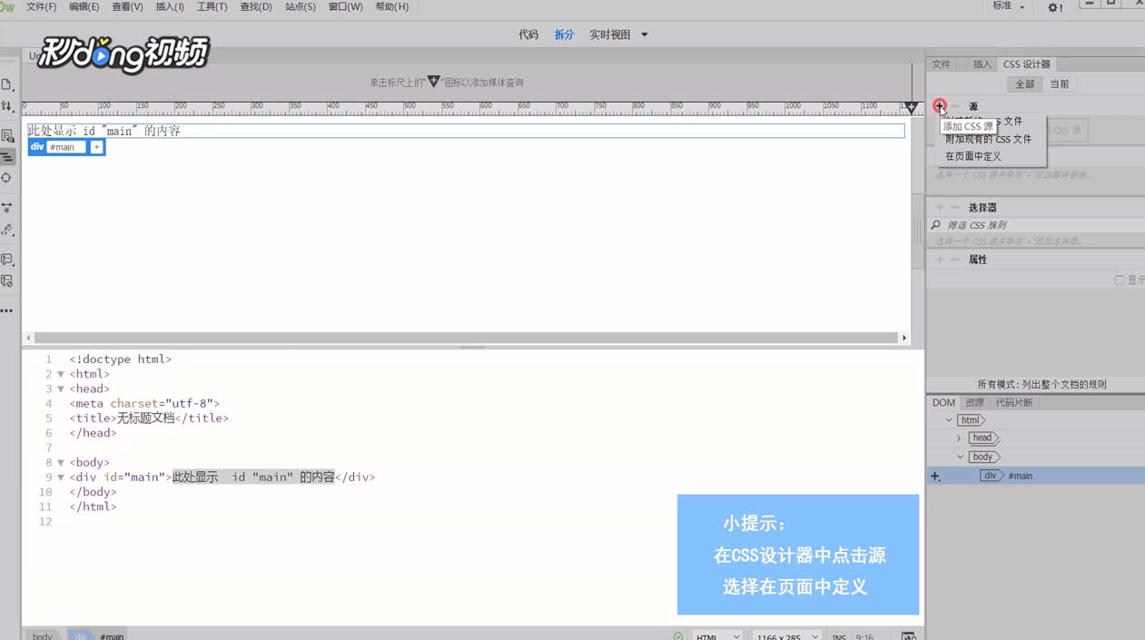 2、在右側的CSS設計器點擊源的加號,選擇在頁面中定義