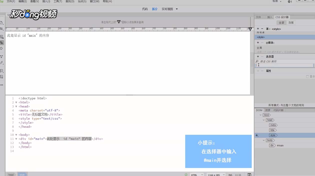 3、點擊選擇器的加號,輸入#main選中