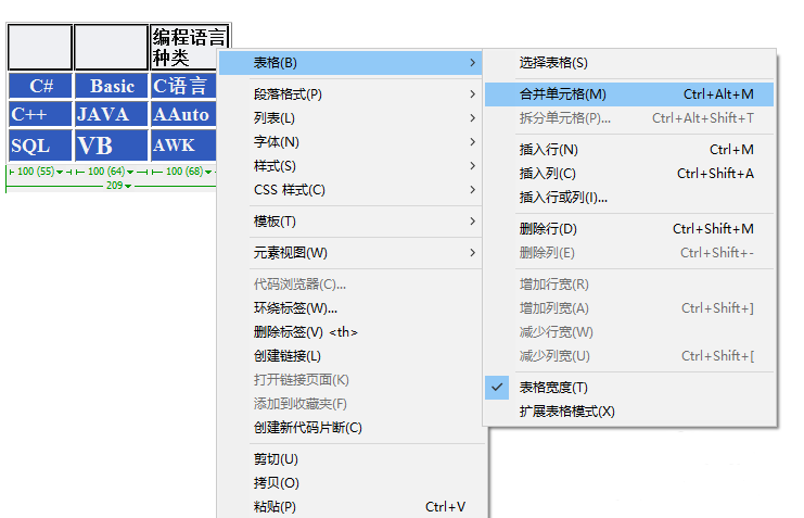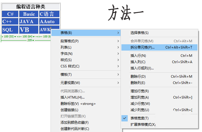 Dreamweaver沒有word或excel那么智能,畢競不是專業表格處理軟件。但它有個特點就是可將單元格拆分成任意數目的行或列,而不管之前它是否是合并過的。比如選中‘AWK‘單元格,鼠標右鍵,依次選擇‘表格->拆分單元格’。