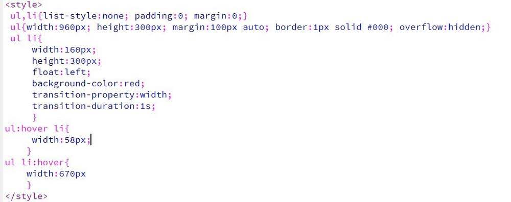 <style> ul,li{list-style:none; padding:0; margin:0;} ul{width:960px; height:300px; margin:100px auto; border:1px solid #000; overflow:hidden;} ul li{width:160px;height:300px;float:left;background-color:red;transition-property:width;transition-duration:1s;}ul:hover li{width:58px;}ul li:hover{width:670px} </style>;