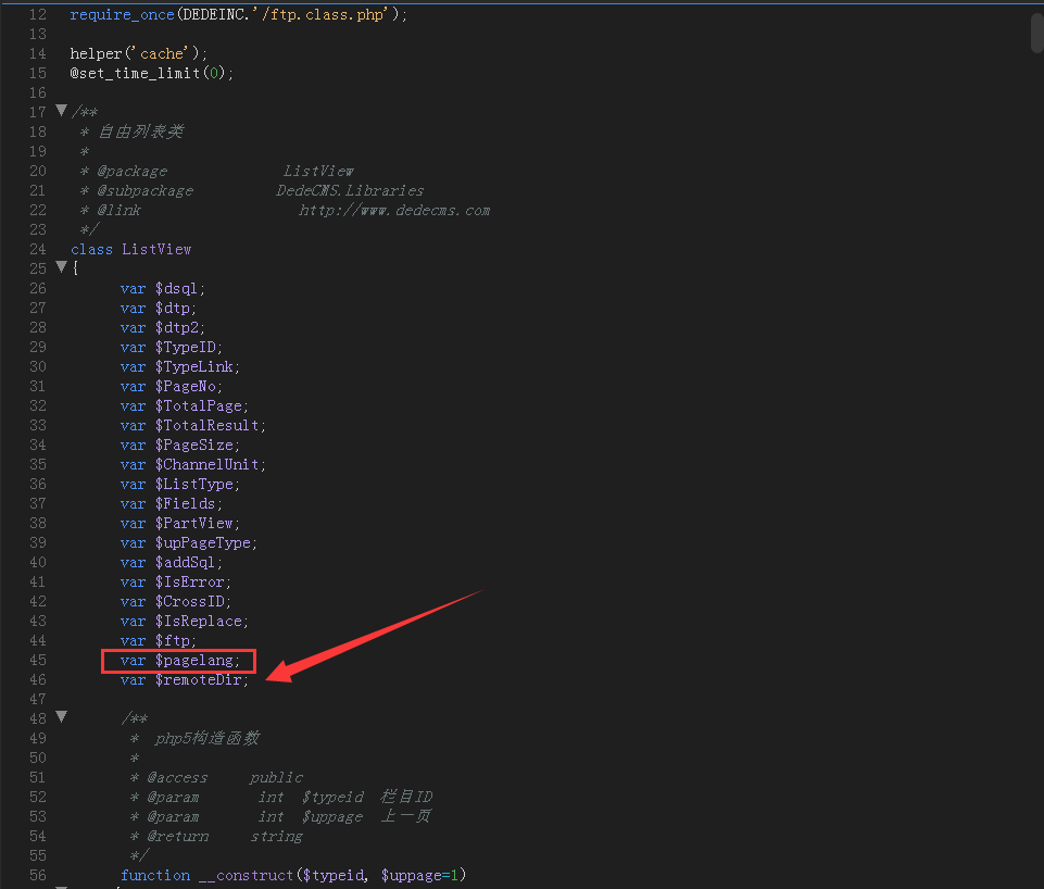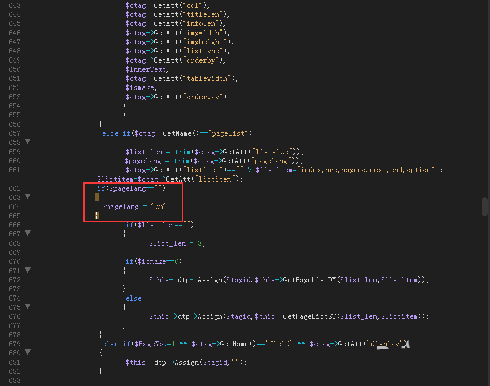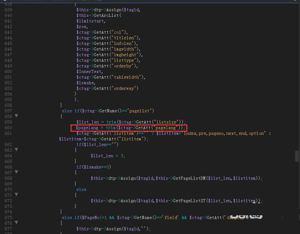 2、繼續(xù)找到(約528行)$list_len = trim($ctag->GetAtt("listsize"));在其下面加上一個新行$pagelang = trim($ctag->GetAtt("pagelang"));