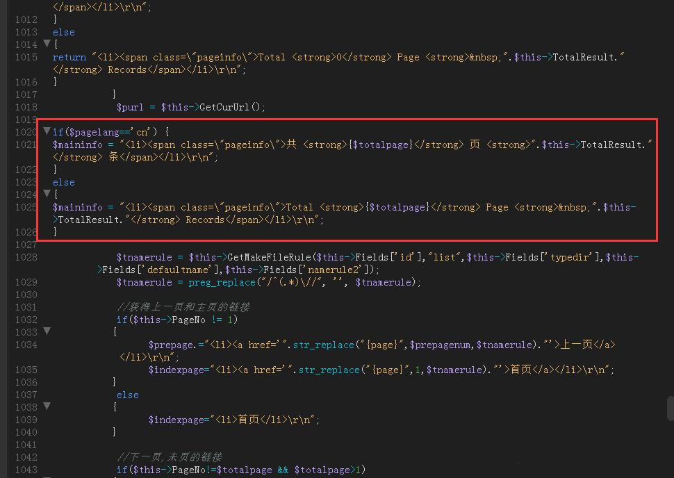 if($pagelang=='cn') {return "<li><span class=/"pageinfo/">共 <strong>1</strong>頁<strong>".$this->TotalResult."</strong> 條記錄</span></li>/r/n";}else{return "<li><span class=/"pageinfo/">Total <strong>1</strong>Page<strong> ".$this->TotalResult."</strong> Records</span></li>/r/n";}修改