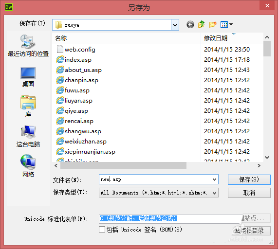 4、在另存為窗口中輸入文件名,后綴是asp,然后點擊保存。