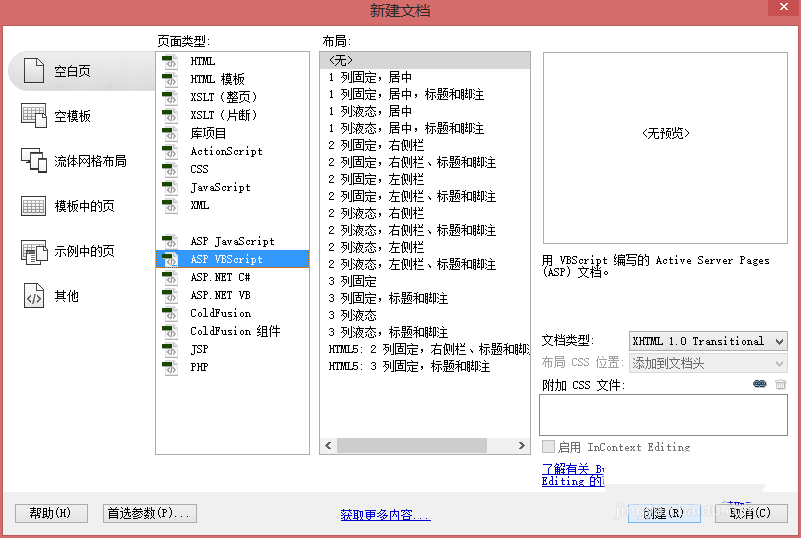 2、在新建窗口中選擇頁面類型為“ASP VBScript”,然后點擊創建。