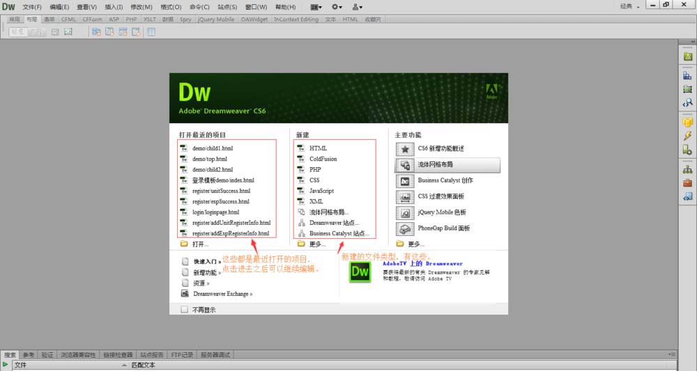 打開Dreamweaver之后,有一個窗口,可以快速選擇之前編輯過的文件,也可以新建不同類型的文件。如果不想下次進來再出現這樣的窗口,可以勾選左下方的“不在顯示”。做網站的原型我們用的一般是HTML搭配css和JavaScript文件做。所以下面我們先新建一個HTML頁面。