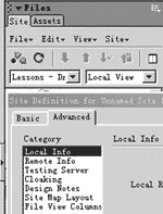 (如圖8)站點治理器給整合到了“file”選項里,雙擊“define a site”即可啟動新建站點向導,同dw 4不同的是,它給出了“sever mode” 和“no sever mode” 兩種方案,假如選擇“sever mode”,則會提供與數據庫連接的向導,并提供對php mysql與asp.net的支持。
