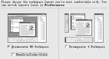 第一次啟動dw mx,它會讓你選擇工作界面(如圖2)。三種選擇分別是dw mx風格、dw 4(dreamweaver 4.0的簡寫)風格和homesite/coder-style風格。其中homesite/coder-style風格指的是純代碼編輯界面,適用于對網頁編程有較高水平的使用者。我們選擇第一種dw mx風格,即可看到dw mx的全新面容。