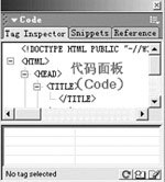 (如圖4)這里包括“tag inspector”、“snippets”、“reference”選項卡,給熱衷于到源代碼中尋根究底的網頁愛好者提供了極大的方便。其中“tag inspector” 選項將整個頁面的html標簽以樹狀形式展開,雙擊標簽即可方便地修改它們的各項屬性,“snippets”選項提供了許多典型代碼的片段,分類也很清楚,直接拖拽到頁面上即可使用。“reference”選項提供了很多網頁編程語言,如html、asp、jsp的參考手冊,假如編程時碰到了什么疑難,可以從這里直接得到幫助。