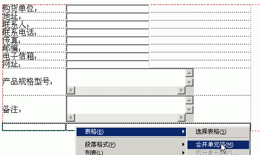 6.重復(fù)輸入文字和插入“文本字段”,給文本字段命名。按住ctrl鍵,選中最下面一行的兩列,合并單元格。