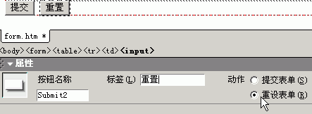 8.選中右邊一個(gè)按鈕,在屬性面板上,動(dòng)作選擇為“重設(shè)表單”。