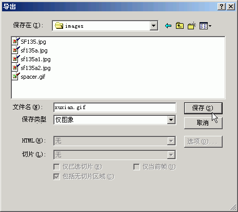 4.在“優化”面板中,設置圖像為gif格式。選擇“文件”/“導出”,保存虛線圖像。