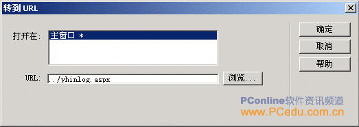 (3)選擇按鈕“注冊”按鈕,在【行為】面板中,添加行為轉到url,在彈出的對話框中,輸入鏈接為“../yhinlog.aspx” 如圖6-1-2所示: