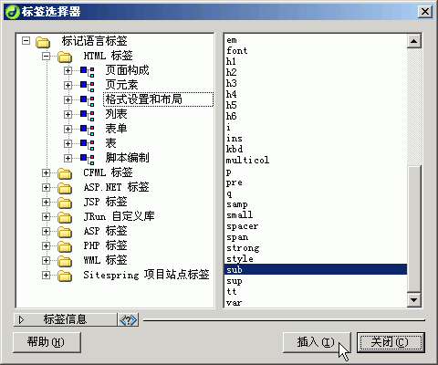 按照輸入上標的方法,在“標簽選擇器”中選擇sub標簽,單擊“插入”按鈕。