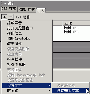 操作步驟:選中一個鏈接,打開“行為”面板,單擊加號 ( ) 按鈕并從“動作”彈出式菜單中選擇“設置文本”>“設置框架文本”。 可以輸入任何有效的HTML。