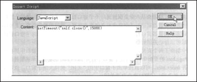 5. 單擊設計視圖窗口中的文檔頭部窗格。選擇菜單Insert/Invisible Tags/Script,打開Inset Script對話框。如圖2所示,在Language下拉列表框中選擇javascript選項,并在Coctento文本框中輸入“setTimeout("self.close()",15000)”。單擊OK按鈕,完成在文檔頭部插入15秒后自動關閉子窗口的腳本。在代碼中,15000表示15000毫秒,也即15秒,也可以根據需要將之修改為自己需要的時間毫秒數。
