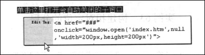 11. 可以通過為該鏈接應用Open Browser Window行為來設置單擊鏈接時打開Index.html窗口,不過更方便的方法是利用快速標識編輯器。方法是首先將插入點放置到鏈接中,然后在狀態欄左端的標識選擇器上,單擊標識按鈕,選中整個鏈接。然后按下Ctrl T組合鍵,打開快速標記編輯器,進入到快速標記編輯器的 編輯標識模式。再在“>”前輸入“onclick="window.open('index.html',null','width=200px,height=200px')"”(如圖4所示)。設置完畢,按下回車鍵,確認操作。