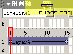 2.這時,我們點擊ALT F9 打開時間軸面板,DW已經為我們添加了默認的時間軸Timeline1,然后,我們選中我們要滑動的圖層layer4,在上面點擊右鍵,選擇 [添加到時間軸] 這時我們可以在時間軸面板中看到我們剛剛制定的圖層layer4,這說明,我們已經添加成功了!
