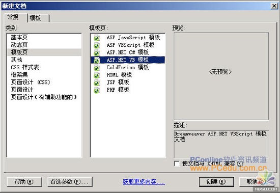 (1)打開【文件】→【新建】,打開【新文檔】的對話框,選擇“類別:”為“模板頁”,選擇“模板頁:”為“ASP.NET VB 模板”,結果如圖4-1-2所示。