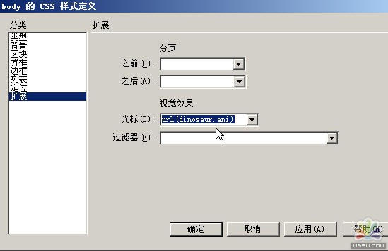 ( 2 )在擴展選項中的【光標】一項中輸入“ url(mb5u.ani) ”,然后單擊確定按鈕,如圖 3 所示。
