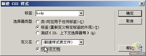 ( 1 )使用【新建】命令插入 body 標簽 CSS 樣式,如圖 1、2所示。
