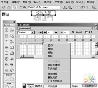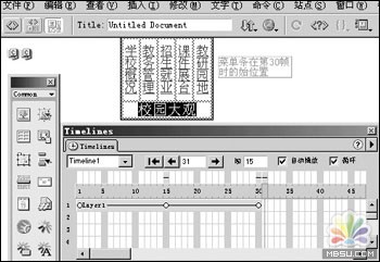 3、現在還要設置一個行為讓時間線停止后能繼續播放。我的設想是這樣的:在一般狀態下菜單條彈回但僅保留下方的“校園大觀”字樣,而菜單條再次彈出和彈回則由鼠標是否經過了菜單條上的“校園大觀”來控制。如此可以這樣繼續進行:選定菜單條中的“校園大觀”(要確保該字樣的超鏈接地址為“#”,即空鏈接)字樣,單擊行為面板中的“ ”按鈕,在彈出的菜單中選擇“Timeline/Play Timeline”,在接著彈出的對話框中選擇“Timeline1”后單擊確定按鈕,這時行為面板中將增加一個行為,在其“Events”下拉列表中選擇“onMouseOver”事件,表示當鼠標處于該字樣上方時播放動畫(如圖4)。