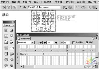 1、選定層面,當鼠標變成“十”字形時按住左鍵將層面拖動到頁面右上角(使整個菜單條完全露出但上邊緣正好靠攏頁面上邊界),在窗口菜單中打開時間線面板,選定層面將其拖動到時間線上,Dreamweaer會自動產生一個長度為15幀的動畫對象,拖動該動畫對象的最后一個要害幀到第30幀,將其長度設置為30幀。然后在第15幀處單擊右鍵,在彈出的快捷菜單中選擇“添加要害幀”選項插入一個要害幀,并將層面拖動到適當位置(如圖2)。在時間線窗口中的第15幀處再次單擊右鍵,在彈出的快捷菜單中選擇“添加動作”,為該幀添加一個交互行為,Dreamweaer將自動打開行為面板。單擊行為面板中的“ ”按鈕,從彈出的菜單中選擇“Timeline/Stop Timeline”,打開“Stop Timeline”對話框,選擇“Timeline1”后單擊“確定”按鈕關閉該對話框。交互行為的事件為“onFrame15”,動作為“Stop Timeline”,這樣當時間線運行到第15幀時,動畫將停止播放,這樣就實現了菜單條彈回的功能。