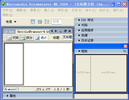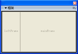 2、選擇「窗口」菜單>“框架”,彈出“框架”面板如下圖。從框架面板可知,系統(tǒng)對左右框架生成命名。左框架名為:leftFrame,右框架名為:mainFrame,當(dāng)然您可以通過框架屬性面板對框架重新命名,了解這一點非常重要。創(chuàng)建超級鏈接時,要依據(jù)它正確控制指向的頁面。