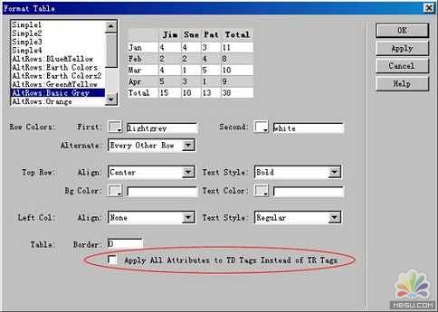 (2)出現format table窗口,左上角有各樣式,可根據你的喜好來選擇,因為其余各項都是傻瓜式的操作,在這里就不一一介紹了,只是對最后一項強調一下,該項是詢問你是否把各樣式代碼添加到TD標記里而非默認添加到TR標記中,在這里筆者建議你不要勾選,否則會生成比默認設置多得多的代碼。