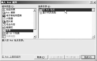 首先打開剛才創(chuàng)建的網(wǎng)頁new.htm,切換到網(wǎng)頁視圖,將插入點(diǎn)放在要?jiǎng)?chuàng)建目錄的位置,然后執(zhí)行“插入/web組件”命令,在打開的對(duì)話框中,選擇“目錄”(如圖3),并在右邊的窗格中,選擇“該web站點(diǎn)”后單擊“完成”按鈕。