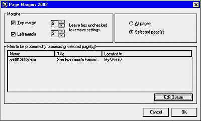 這個程序預設會將這兩個設定值套用在目前網站里面的所有頁面。不過在實際使用的時候,即使你選擇了「僅套用在選擇的頁面(selected pages)」這個選項,你還是不會在「文件」區域里面看見目前網站的所有頁面列表。如果你想把邊界設定套用在網站中的某幾個頁面,你必須先打開該網站,然后選擇前面提到的「僅套用在選擇的頁面」選項,然后按下「編輯隊列(edit queue)」按鈕。