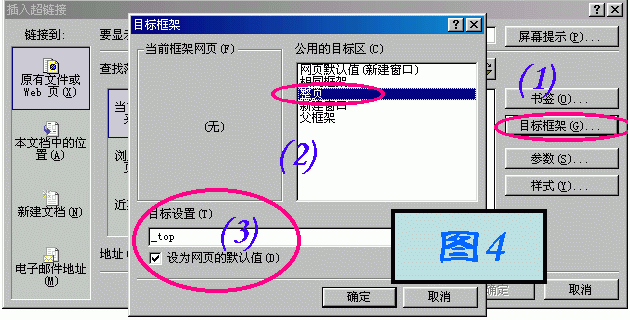 8、編輯狀態(tài)下,分別打開“top.htm”和“l(fā)eft.htm”兩個頁面,對各主要按鈕設(shè)置鏈接到相關(guān)頁面。此處特別提醒:凡是嵌入式頁面中的鏈接按鈕,要注意目標頁面的打開方式,要么設(shè)置成新窗口(blank)方式打開,要么你設(shè)置成“整頁”(top)方式打開(下圖4)!否則的話,會出現(xiàn)極大混亂的!要不信的話,呵呵,你閑著沒事時試驗試驗?再就是,建議不要用_blank方式!原因不告訴你!