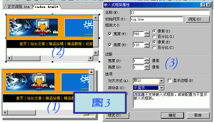 4、確定后,你會發(fā)現(xiàn)它帶有滾動條且尺寸不適!哈哈,不打緊的,你只須將鼠標指向其邊緣并單擊,當四周出現(xiàn)帶有8個黑色矩形點時表示已經(jīng)選中,然后雙擊,在彈出的“嵌入式框架屬性”框中,據(jù)需設(shè)置好框架及其邊距的寬度高度、去掉“顯示邊框”前的“√”、并設(shè)置滾動條的顯示狀態(tài)為“不顯示”(下圖3),最后確定退出!(注:隨后保存瀏覽若感覺不滿足須再回來修改哦!)