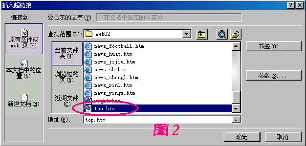 3、點按“設(shè)置初始頁”按鈕,從你的web夾中找到要顯示在此框架中的網(wǎng)頁“top.htm”并確定(下圖2)