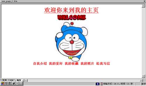 筆者在原先“welcome”的圖片下面再插入一張小叮當的圖片,在小叮當的圖片下面再添加了一些內容。這樣整個頁面就做好了:)是不是很不錯了?夠專業了吧:)什么?還不專業?哦,對對…… 的確還不專業,因為這個網頁上缺少了超級連接。