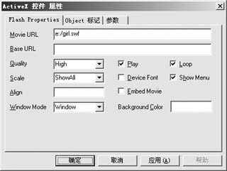 雙擊網(wǎng)頁(yè)中出現(xiàn)的白色矩形區(qū)域,打開(kāi)“activex控件屬性”對(duì)話(huà)框,如圖5所示。在“movie url”后的文本框中輸入要插入的flash動(dòng)畫(huà)文件的鏈接地址,并在“quality”后的下拉列表中選擇flash動(dòng)畫(huà)播放品質(zhì),在“scale”后選擇顯示比例,比如“show all”(完全顯示),最后單擊“確定”按鈕返回即可看到網(wǎng)頁(yè)中的動(dòng)畫(huà)了。