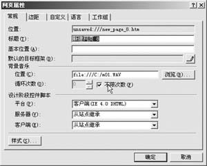 在網(wǎng)頁(yè)空白處單擊鼠標(biāo)右鍵,在打開(kāi)的快捷菜單中選擇“網(wǎng)頁(yè)屬性”命令,在“背景音樂(lè)”欄中的位置后面單擊“瀏覽”按鈕,選擇需要播放的背景音樂(lè)文件,最后“確定”返回。接著選中“不限次數(shù)”單選框,這樣就可以使網(wǎng)頁(yè)自動(dòng)循環(huán)播放背景音樂(lè)了,如圖3所示。 如果取消“不限次數(shù)”單選框,還可以根據(jù)自己的需要設(shè)置背景音樂(lè)的播放次數(shù)。