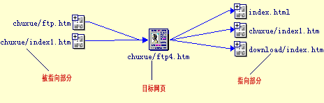 點擊“查看”-“超連接”或是直接點擊左邊的“超連接”按鈕都可以進入連接查看窗口,這時窗口會提示你“在左邊的文件列表中任意的選定一個目標文件”,選中以后在右邊窗口中會自動顯示目標網頁的雙向連接情況(即指定及被指向的所有網頁),并且通過箭頭標出,如圖顯示一個簡單的例子