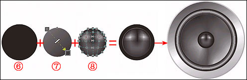 ④、第四個,模擬喇叭音盤的圓形,我們用了“網狀填色工具”,在中央偏左下和右下側邊緣的兩部分填上很淺的灰色;