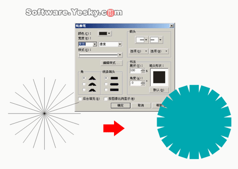 用箭頭工具框選所有直線,點擊輪廓工具按鈕在彈出菜單中點擊“輪廓筆對話框”按鈕,或按快捷鍵f12,彈出“輪廓筆”對話框。在此我們設置一個適當的線寬。在寬度后的單位列表中設定一個單位,比如像素。在前面的列表中直接輸入一個數值,確定線寬的像素值。因為,筆者在制作web圖形,為了便于觀察把單位設成了像素,一般用于平面印刷或噴繪時一般使用的單位是毫米。還可以在此設定線的顏色,不過更多人習慣通過右擊色盤來確定線色,這要比在此設定要方便許多。最后確定設好線寬(如圖4)。