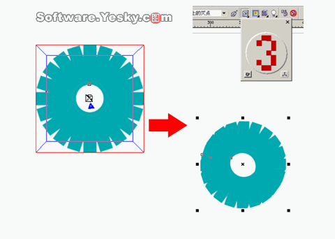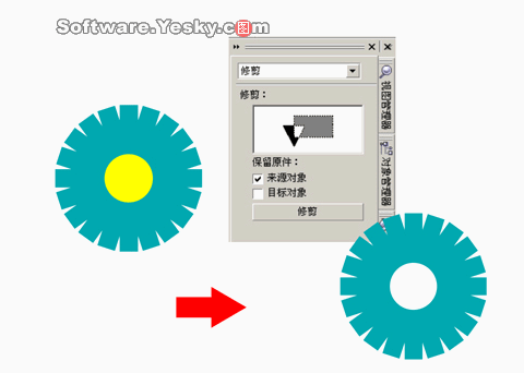 先選中小圓,在菜單->窗口->泊塢窗->造形,打開造形泊塢窗。在列表中選中修剪項。點“修剪”按鈕,這時光標會發生變化。點擊,齒輪圖形,完成修剪。這時你看到效果,你可以把兩個圖形移動,就能夠看到修剪后的效果(如圖6)。
